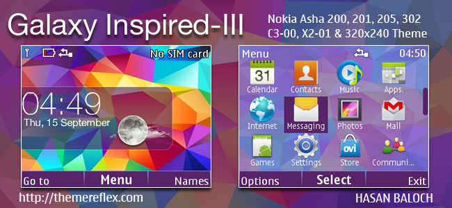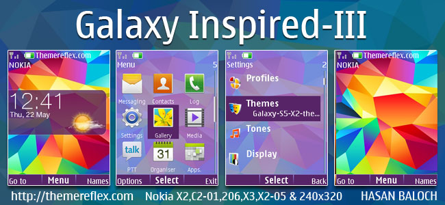 Tác giả: Hasan Baloch Giới thiệu: Theme phong cách galaxy s5, full icon Android. Hình nền là flash báo ngày, giờ, thời tiết (ảo). Màu chủ yếu là tím. Mình thấy dùng rất đẹp Màn hình 240x320: